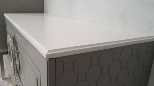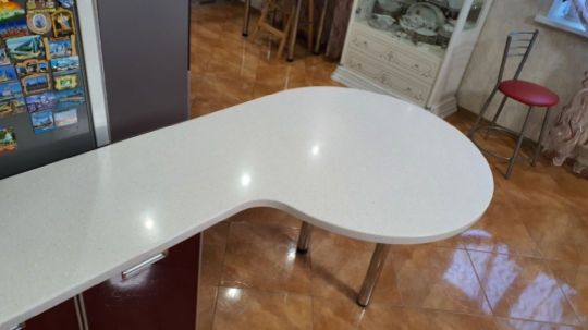 Столешницы будут выполнены по технологии "бесшовной стыковки", без швов и стыков даже при большом размере и сложной геометрии. Столешницы могут быть выполнены с отверстиями (прорезями) для конвекции. Столешницы будут выполнены по Вашему желанию любой сложной формы, с любыми искривлениями и радиусными элементами, любой толщины, с любой формой обработки кромки.